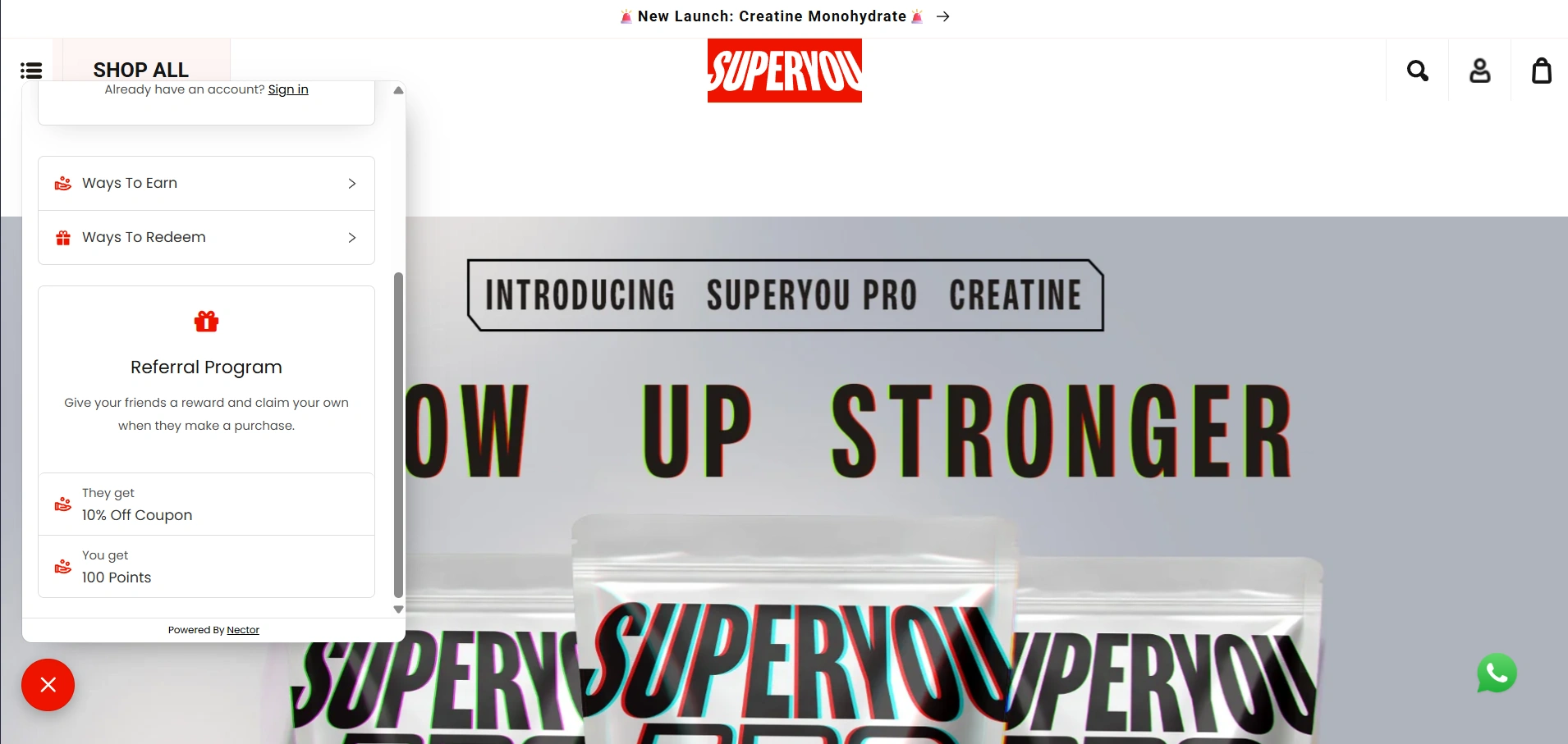 Nector’s on-site referral widget on SuperYou makes it easy for customers to invite friends, clearly showcasing rewards for both sides and driving high referral participation.