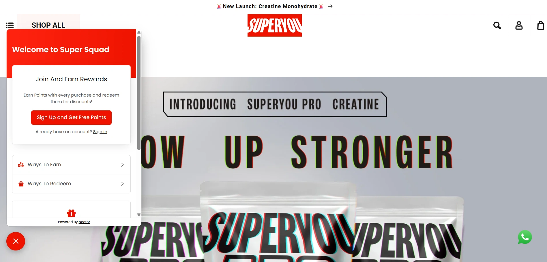 Nector’s loyalty widget on SuperYou highlights the “Super Squad” rewards program, encouraging quick sign-ups while giving customers easy access to earning, redemption, and rewards tracking.