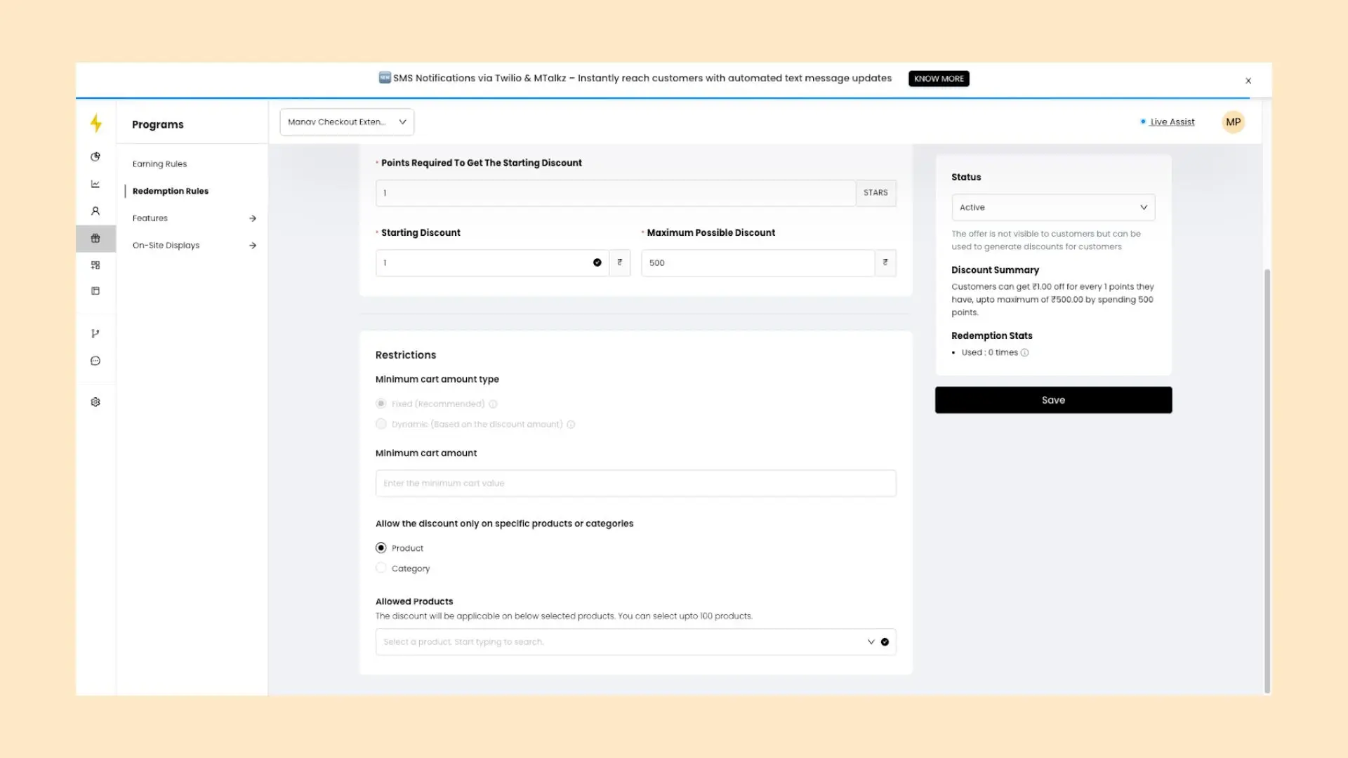 - Message Templates: "Earn [X] points on this purchase. Use them for discounts on your next order!" "Saved ₹[X] using your points"