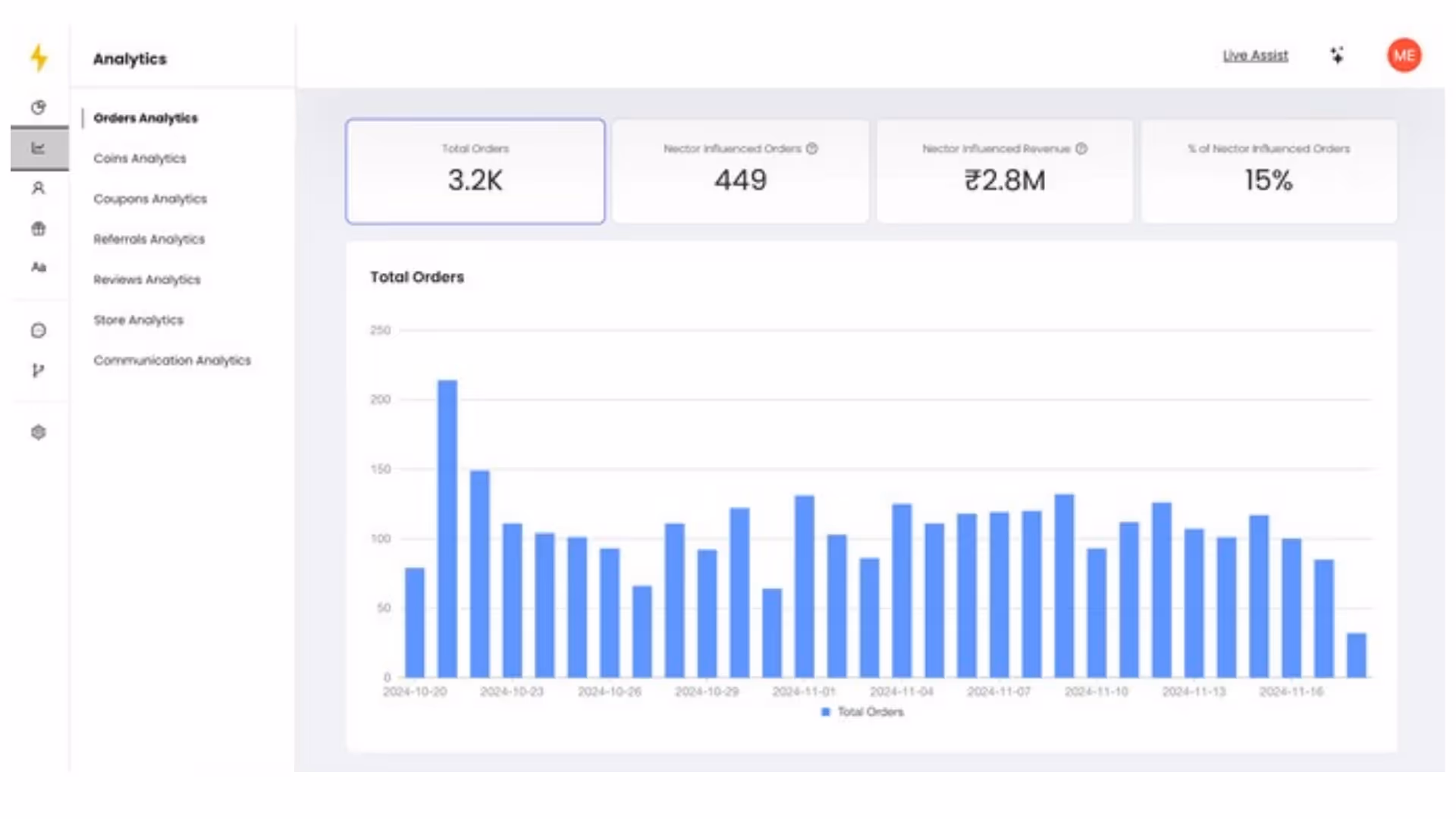 Once your loyalty program is established, it’s essential to evaluate its performance and impact on your business. This evaluation may include tracking orders, coupon usage, completed referrals, and more. By analyzing this data, you can adjust your loyalty strategy according to your program's statistics. Nector provides you with in-depth insights into every aspect of your loyalty program's performance directly from the dashboard.