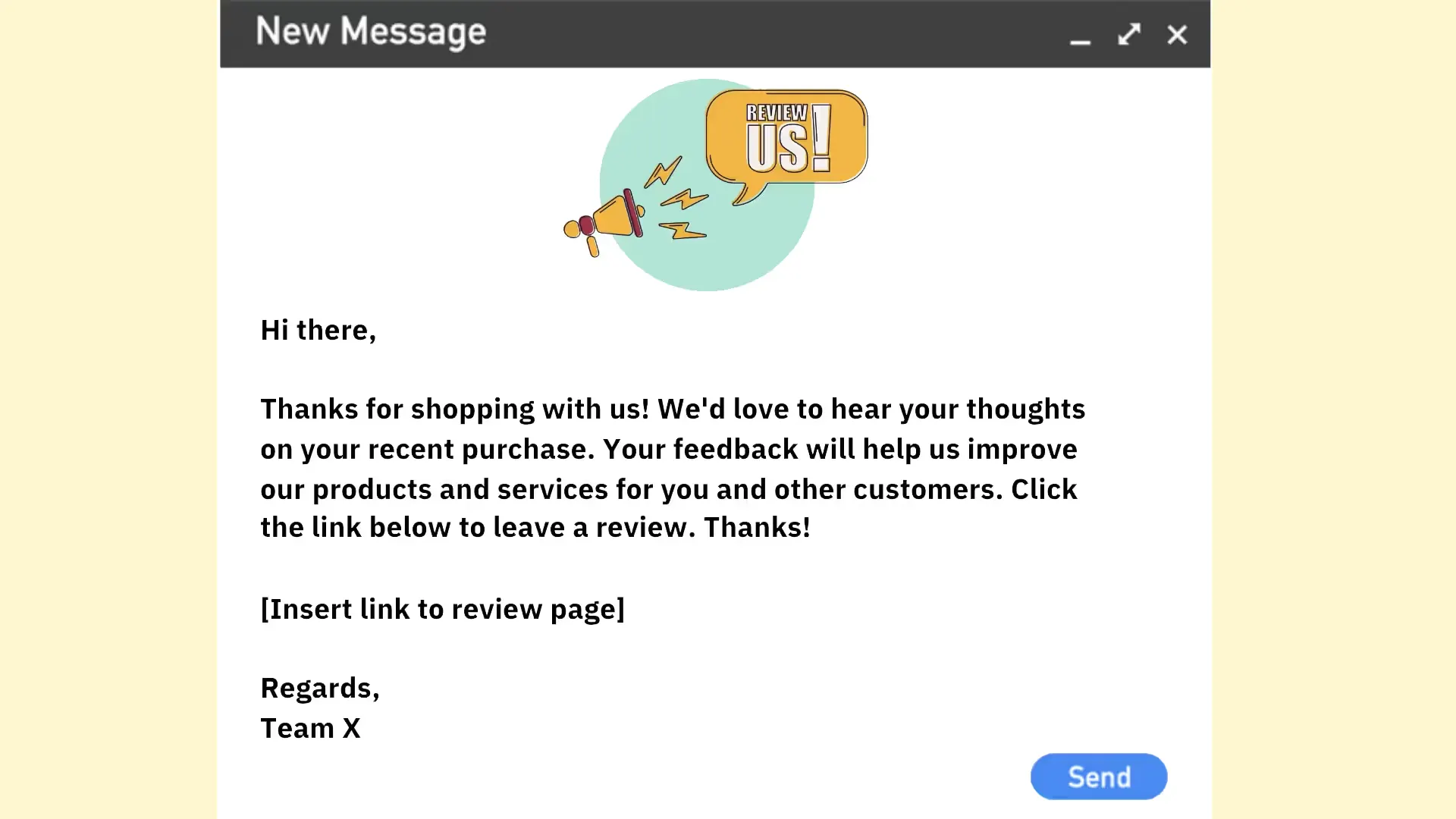 - "Hi [Customer's Name], how was your recent purchase? Share your experience and help others make informed decisions. Leave a review now!"
